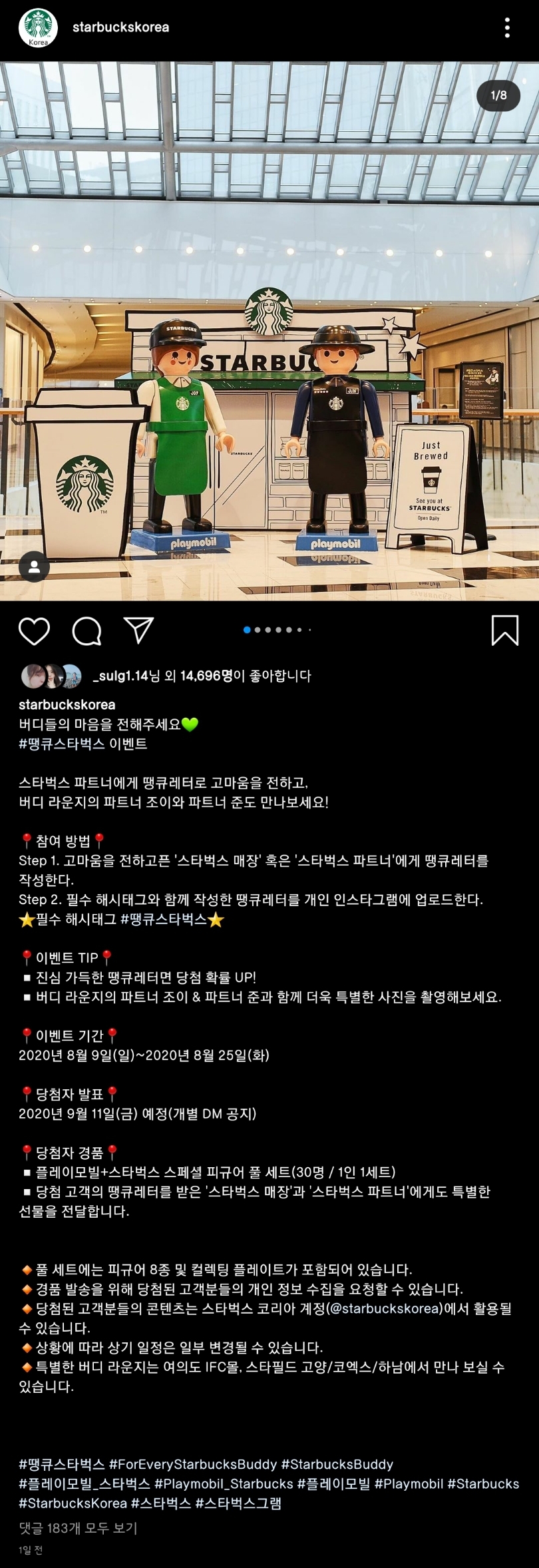 스타벅스 인스타 계정을 가시면 또 다른 이벤트가 진행 중입니다. 바로 땡큐 스타벅스인데요. 고마움을 전하고픈 스타벅스 매장 또는 스타벅스 파트너에게 땡큐 레터를 작성하면 추첨을 통해 플레이모빌 + 스페셜 피규어 풀 세트 (30세트)를 드린다고 하니 관심 있으신 분들은 참여해보시는 것도 좋을 거 같아요.