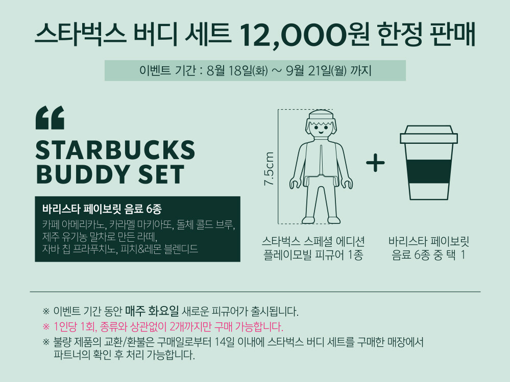 이벤트는 8/18(화)부터 9/12(월)까지 진행이 되고요, 바리스타 페이보릿 음료 중 하나와 스타벅스 스페셜 에디션 플레이모빌 피규어 1종을 해서 12,000원에 파는 한정 이벤트입니다.