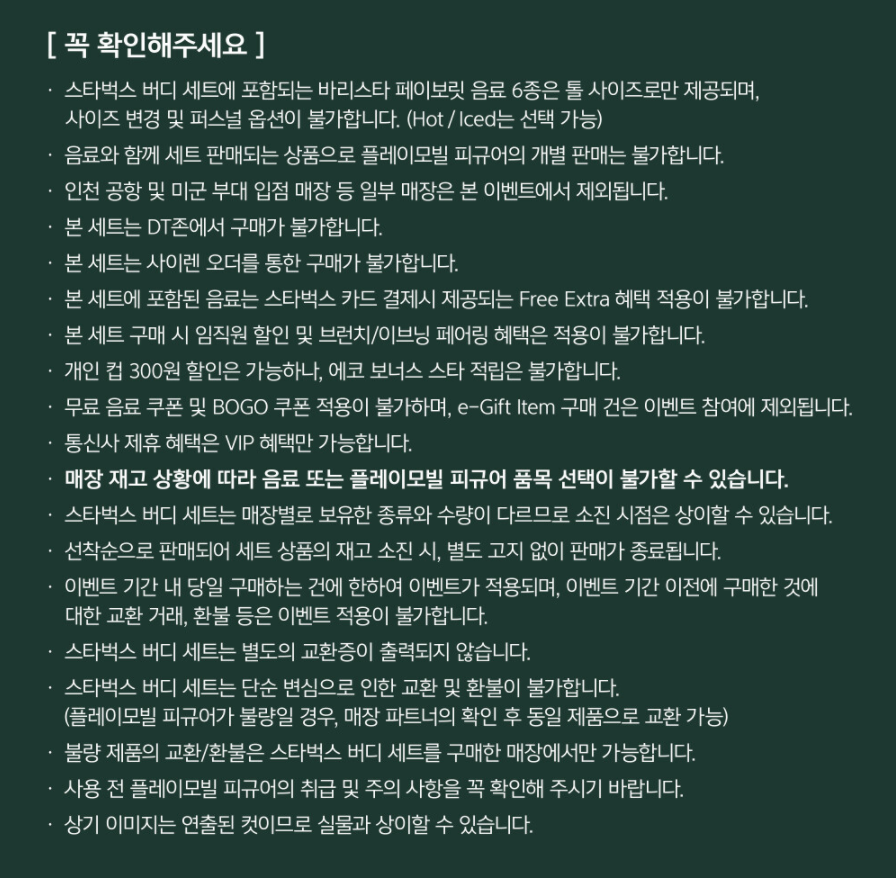 이벤트 기간 동안 매주 화요일에 새로운 피규어가 나온다고 되어 있는데, 그럼 한 피규어를 한주씩만 판다는 건지.. 아님 매주 종류가 쌓이는 건진 잘 모르겠어요 ㅎㅎ 아무튼 보통 플모 가격이 5000~7000원 사인데 스페셜 이벤트 플모임에도 가격이 그렇게 비싼 거 같지 않아서 좋습니다. 대신 평생 안 가던 스벅을 가야 한다는 점이 저에겐 뼈아픈 단점이네요 ㅠ