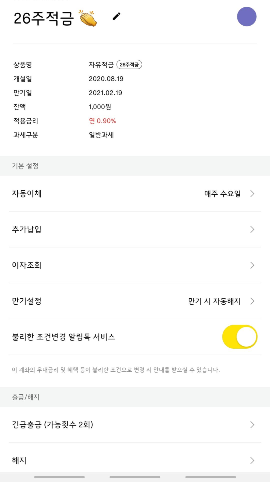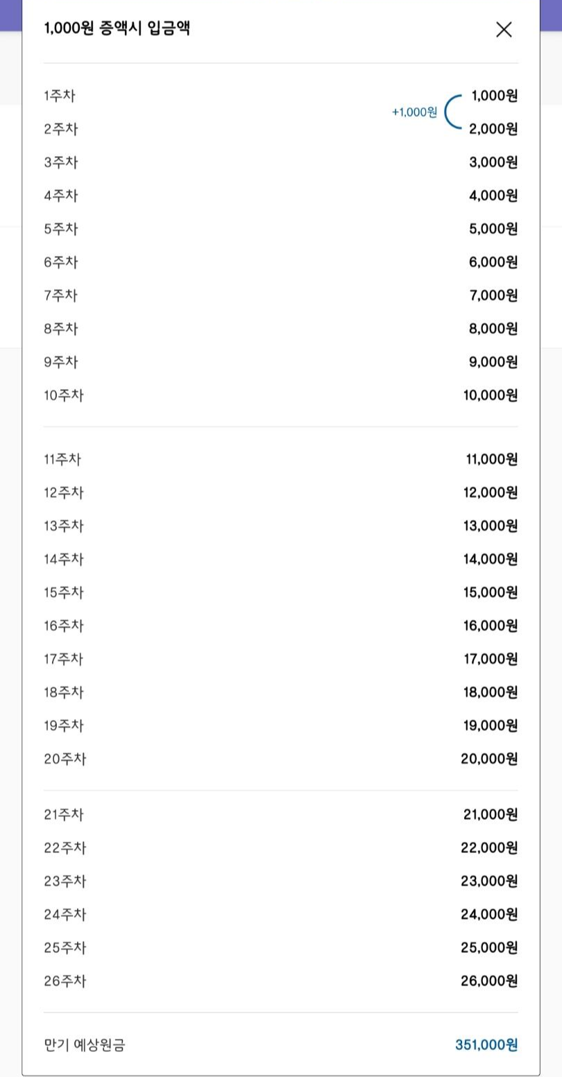티 안 나게 목돈 모을 수 있어서 항상 26주 적금을 걸어두는 편입니다. 마지막 달쯤엔 돈이 쫌 많이 나가 부담이 되긴 하지만 곧 만기가 되어 35만원 정도 모을 수 있기에 항상 1000원씩 증액해서 걸어두는 편입니다. 사실 이자는 거의 없다시피 하지만 돈을 꾸준히 모아 목돈 마련한다는 의미에서 그리고 크게 부담 안 되는 선에서 할 수 있어서 자주 이용합니다. 카카오페이의 알/동전 모으기와 같이 말이죠