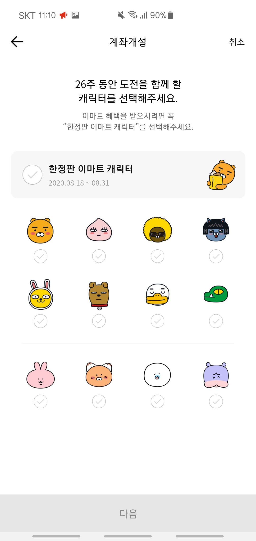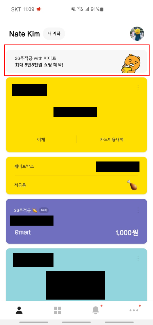 카카오 뱅크 들어가시면 메인 화면 상단에 26주 적금 with 이마트 배너가 있습니다. 타고 들어가면 그 뒤론 쉽습니다. 약관 읽어주시고, 카카오 캐릭터 선택해주시고 얼마씩 할 건지 정하시면 끝!! 이율이 높지 않기 때문에 이마트 할인을 위해서 가입을 하시는 분들은 최소금액으로 하시는 걸 추천드립니다 ^^.