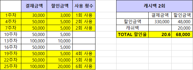 캐시백 2회를 최대 받기 위한 6회 쿠폰 사용을 충족시켰을 시 최종 68,000원을 할인받을 수 있습니다. 사용금액은 330,000원으로 최대 사용보다 많이 줄어들기 때문에 할인도 꽤 받으면서 이마트를 적당히 이용하시는 분들에겐 좋은 시나리오인 듯 싶습니다. 할인율은 계산상 20.6%가 나오네요.