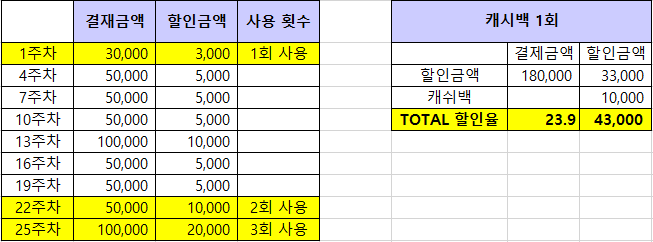 캐시백 1회 조건은 쿠폰 3회 사용을 충족 시 최대 43,000원을 할인받을 수 있습니다. TOTAL 사용금액은 180,000원으로 적당하지만, 그에 반해 할인율은 이 3가지 방법 중 최대입니다(무려 23.9%). 제가 가장 욕심나는 시나리오입니다. 평소 이마트를 자주 안 가기 때문에 이 방법이 저에겐 가장 맞을 거 같아요.