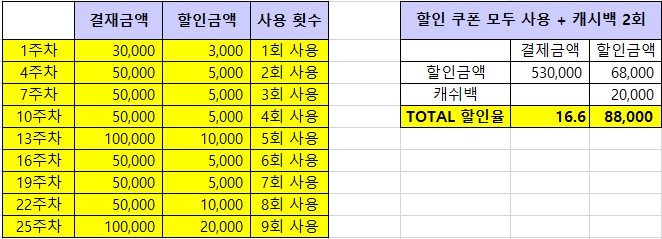 최대 할인을 받기 위해선 모든 쿠폰을 사용해야 하며 2번의 캐시백을 받아야 합니다. 결제 금액은 딱 맞출 시 530,000원을 사용해야 하며 할인은 최대 68,000원을 받을 수 있습니다. 그리고 2번의 캐시백 20,000원을 더하면 총 88,000원을 할인받아 할인율은 16.6%가 됩니다.