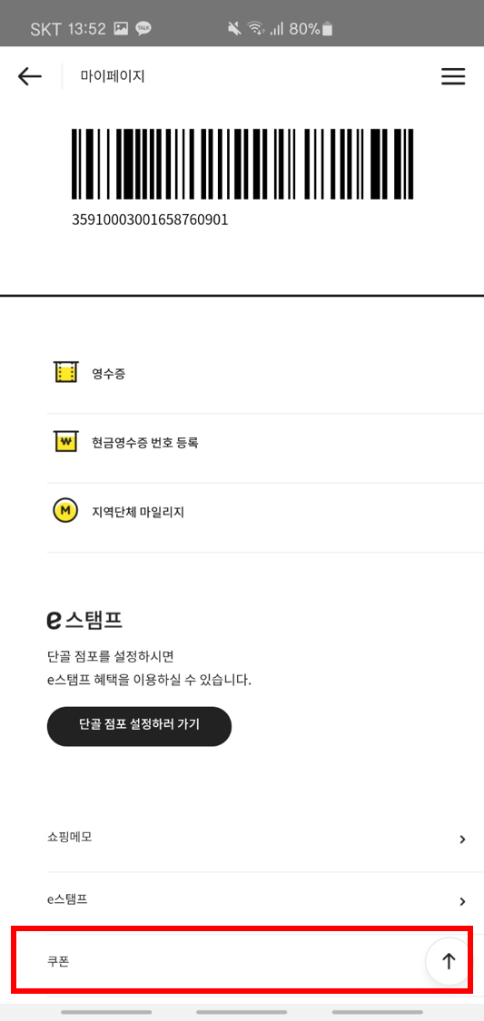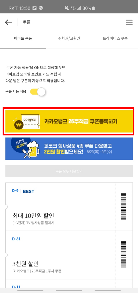 쿠폰은 카카오뱅크 접속 후 26주 적금에 가입하시면 카톡으로 쿠폰이 발송됩니다. 안되시는 분들은 카카오뱅크 어플에서도 확인이 가능합니다. 쿠폰 사용을 위해선 이마트 어플을 필수로 설치 하셔야 합니다. 접속 히 마이페이지 > 쿠폰 에 들어가시면 카카오뱅크 26주 적금 쿠폰 적립 배너가 있습니다. 여기에 발송된 쿠폰 번호를 입력하시면 쿠폰이 등록이 됩니다. 이제 사용만 하면 되겠군요!!