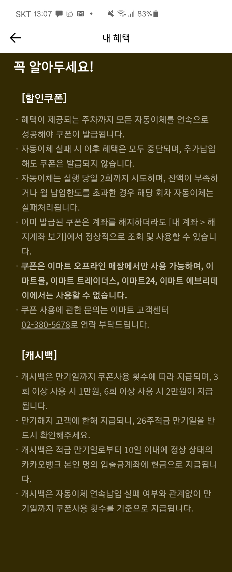 지금까지 카카오뱅크 26주 적금 with 이마트 상품에 대해 살펴보았습니다. 사실 복잡한 것 없고 적금 자동이체로 잘 가입만 해두면 쿠폰 쓰는데 제약도 없는 간단한 혜택 상품입니다. 잘 사용하셔서 26주간 혜택 잘 받아보시길 바랍니다 ^^.
