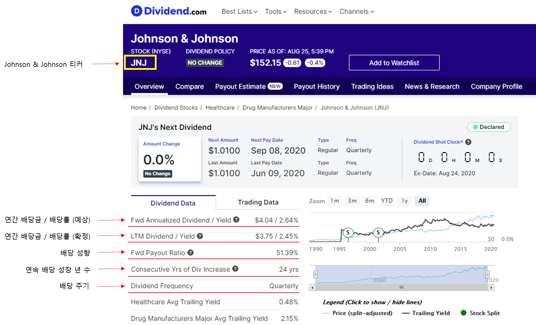 위 사이트 접속 후 찾고자 하는 주식의 티커를 입력하면 아래와 같이 정보가 쭈우우욱 뜹니다. 모두 영어로 되어 있기 때문에 처음엔 헷갈리실 수도 있는데 계속 보다 보면 별거 아닌 걸 알 수 있습니다. 오늘은 예로 JNJ, Johnson & Johnson을 예를 들어 보겠습니다.