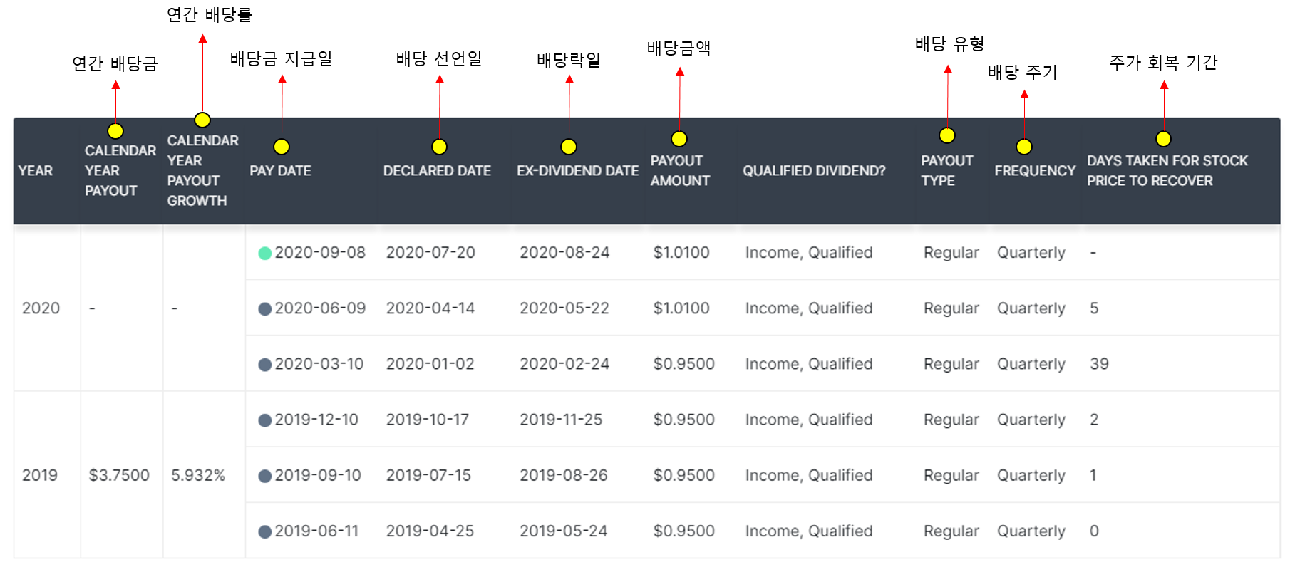 배당을 주는 주기를 나타냅니다. Quarterly는 분기마다 배당을 준다는 의미며 1년에 4번 배당을 줍니다. 미국같은 경우 월배당, 분기배당, 반기배당 등 다양한 배당 주기를 가진 주식들이 있습니다. 제가 가장 좋아하는 월배당은 주가 상승의 힘은 약하지만 월복리를 가능하게 하는 극한의 배당 투자를 가능하게 합니다.
