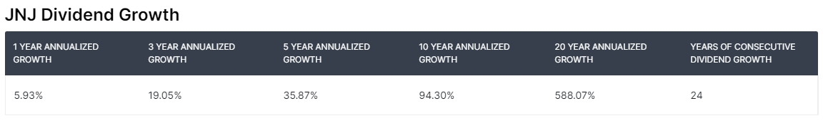 배당 성장률을 보여주고 있습니다. JNJ 같은 경우 1년에 5.93% 배당금이 성장했고 20년 기준으로 무려 588.07% 배당성장이 있었습니다 그리고 가장 중요한 YEARS OF CONSECUTIVE DIVIDEND GROWTH!! 바로 연속 배당 성장 년수 무려 24년이 됩니다. 엄청 커 보이 긴 하나 사실 미국 주식에는 이보다 더 대단한 배당주식들이 많이 있습니다. 흔히들 알고 계시는 배당킹, 배당귀족 같은 주식들인데 관련 내용은 다음에 다뤄보도록 하겠습니다.
