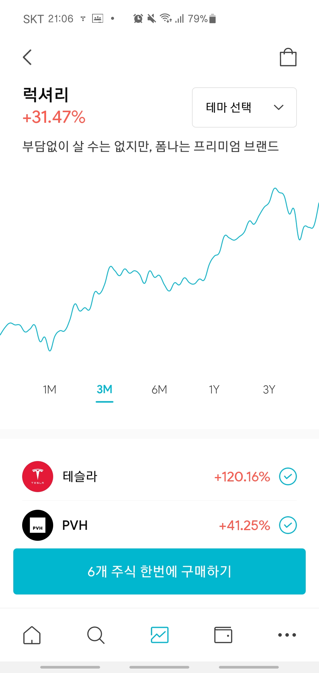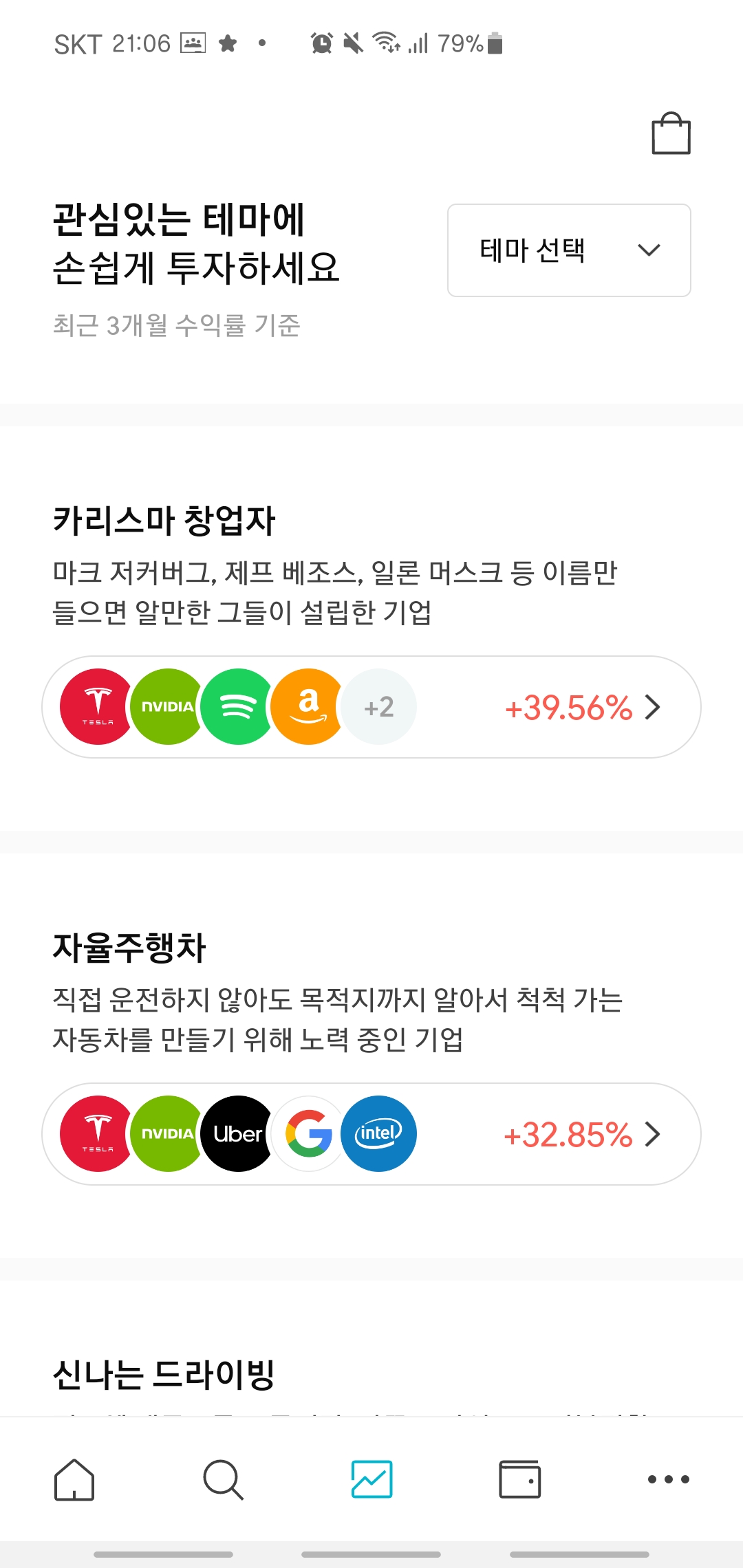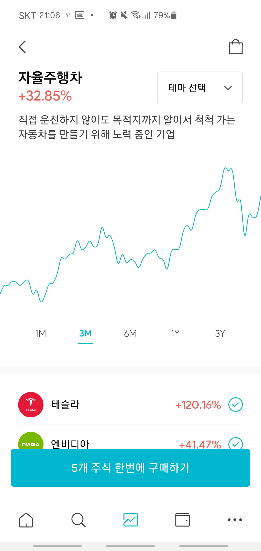 그리고 섹터별로 그러니깐 테마별로 정리도 아주 잘 되어 있습니다. 각각 섹터별로 수익률도 한 번에 볼 수 있고 섹터를 한꺼번에 소액으로 주문을 넣을 수도 있습니다. 자율주행차, 럭셔리 테마 등등을 보시면 아래와 같이 테마섹터 전체 수익률과 차트, 그리고 테마 전체 주문 기능을 제공하고 있습니다.