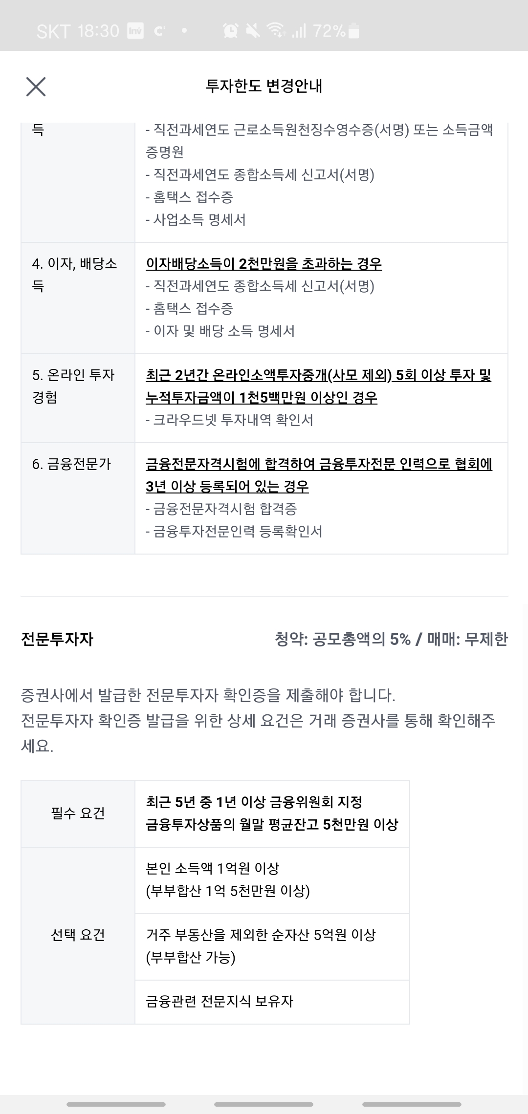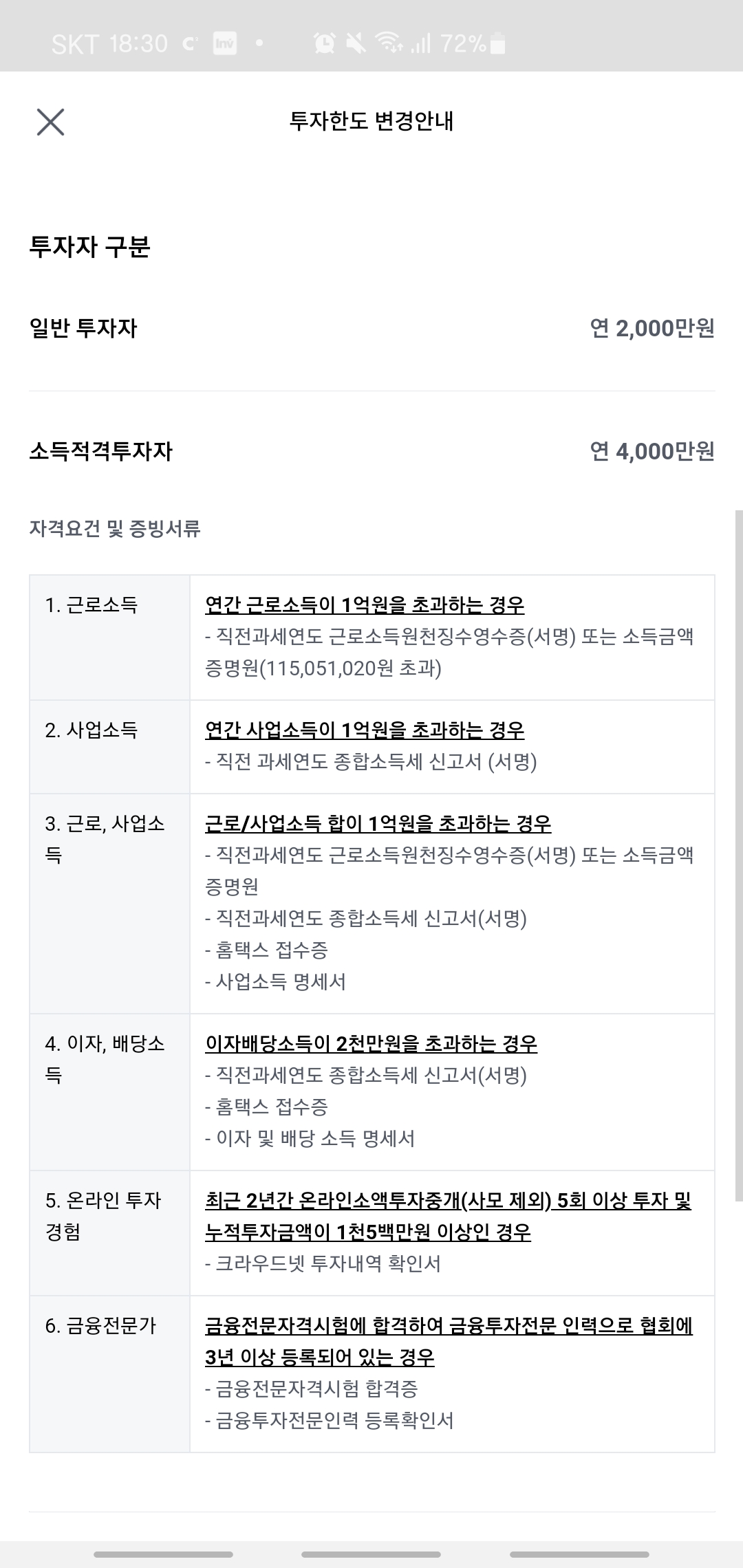 그리고 지금은 일반 투자자는 년 투자 한도가 2,000만 원으로 제한이 되어 있습니다. 물론 증빙서류를 내고 하면 조금씩 올라갈 수도 있습니다(아래 이미지 참조). 추가로 사고팔 때마다 부가세가 0.2%씩 부과되며 이자 및 배당소득은 또 따로입니다. 현재 연결 가능한 계좌는 하나은행뿐이어서 이용을 하시려면 하나은행 계좌를 비대면으로 개설해야 하는 불편함은 있는 것 같습니다.