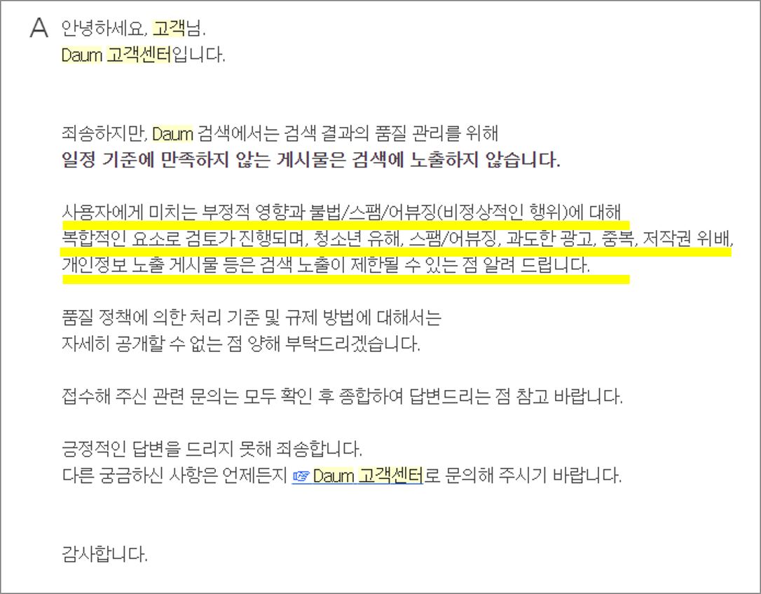 두 번째 답변엔.. 사용자에게 미치는 부정적 영향과 불법/스팸/어뷰징? 그런 적 없는데 ㅠㅠ 제가 여기서 살짝 걸리는 건 과도한 광고, 중복, 저작권 위배 이 부분인데.. 사실 전 그렇게 광고 많이 하지도 않고 글도 최대한 제가 쓰려고 하고 있는데.. 이 부분도 살짝 억울하네요.